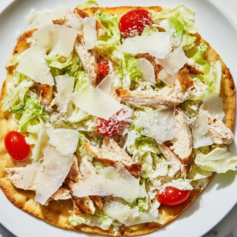 Save My neighbor knocked on the door one evening holding a bag of flatbreads she couldn't use before leaving town. I had leftover grilled chicken and a bottle of Caesar dressing in the fridge, and what started as a random weeknight experiment turned into something I now make on repeat. It's not quite pizza, not quite salad, but somewhere in between where everything just works. The crispy base, the cool crunch of romaine, the hit of Parmesan—it all comes together in less than half an hour. I've served it to friends who thought I'd ordered takeout.