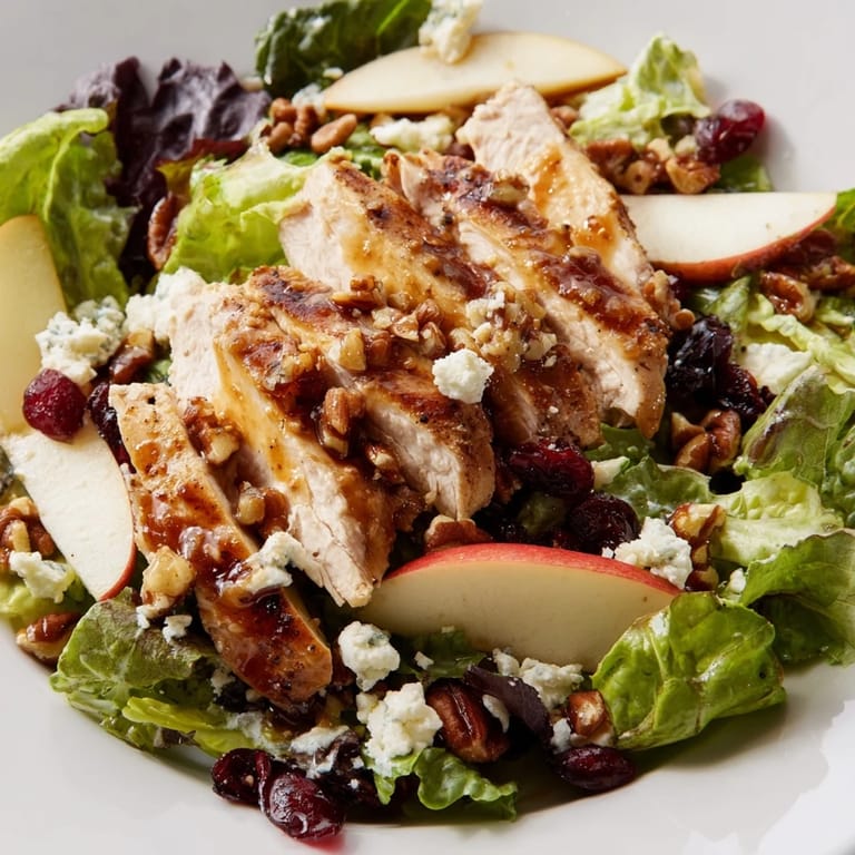 - Spread the mixed greens across a large platter or divide them among individual plates. Scatter the apple slices, chicken, cheese, cranberries, red onion, and pecans over the top in whatever order feels right.