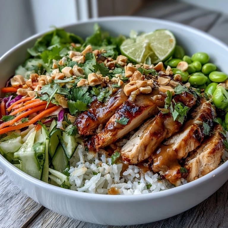 This bowl works because every element brings something different to the table, and none of them overshadow each other. The coconut rice acts as a gentle, creamy foundation that doesn't compete with the other players. The grilled chicken provides structure and substance, while the raw vegetables add brightness and crunch that you're craving without knowing it. The peanut sauce is the storyteller that brings everything into focus, reminding you why you took the time to cook in the first place.