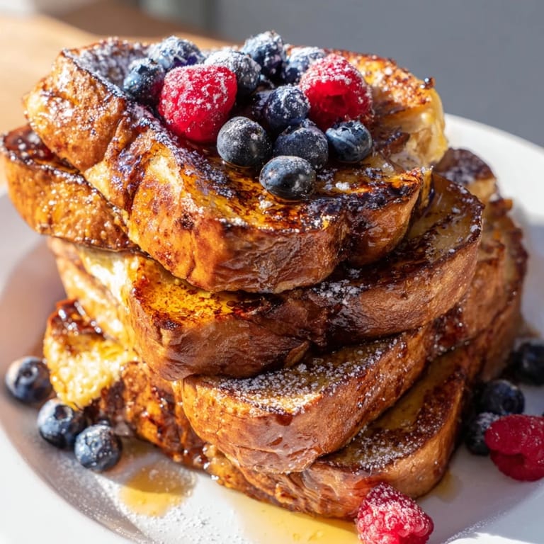 Warm maple syrup soaks into the crispy edges while fresh berries add a bright contrast to the richness. A light dusting of powdered sugar is optional but transforms the presentation if you're feeding people who care about such things. Whipped cream is amazing but honestly, these slices are rich enough on their own that toppings are more about what sounds good in the moment.