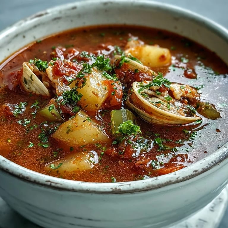 Save The sharp scent of the sea filled my kitchen the first time I made Manhattan clam chowder. Unlike its creamy New England cousin, this version's bright tomato broth reminded me of summers spent at my grandfather's fishing cabin where we'd gather clams at dawn. The recipe evolved during a particularly chilly autumn when I craved something warming yet light. I remember how the steam fogged up my kitchen windows as the chowder simmered, creating a cozy barrier between my home and the rain-soaked world outside.