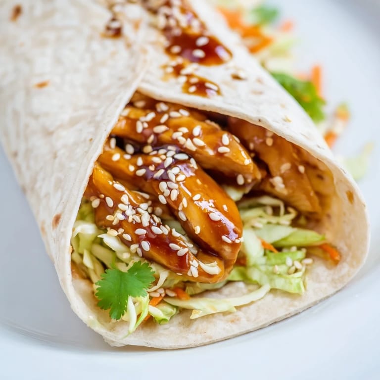Swap the chicken for thinly sliced pork or even tofu if you want to mix things up. Add a drizzle of sriracha or tuck in sliced fresh chili for heat that cuts through the sweetness. I've also used rotisserie chicken when I'm too tired to cook from scratch, and it works beautifully. You can switch to whole wheat or gluten-free wraps depending on what you need, and the recipe doesn't miss a beat.
